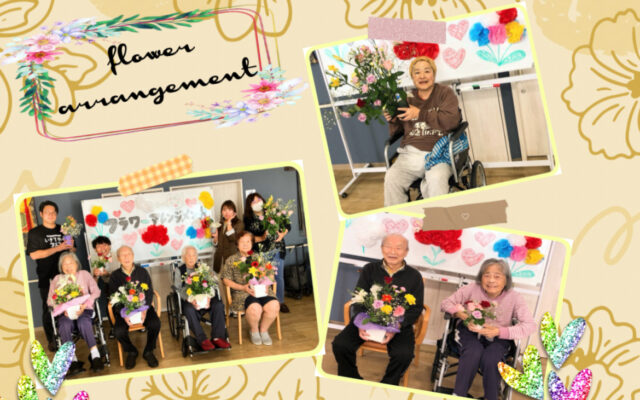 フラワーアレンジメント💐レクリエーションを行いました!! 色とりどりのお花をご用意し、お好きなお花を選んでご自由にアレンジを楽しんでいただきました😊 完成した作品は、とても素敵な仕上がりです!! みんなで記念撮影☺️☺️…