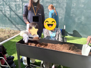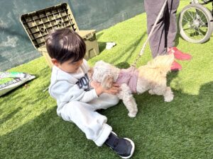 ケア・キューブいくの、本日のレクリエーションでは施設裏にある芝生でわんちゃんや子どもたちと遊んだり、チューリップ🌷を植えました。