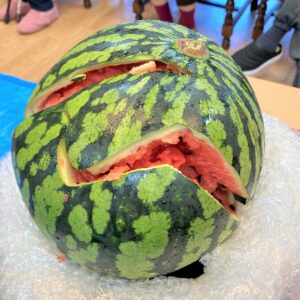 皆様で「がんばれー」と応援しあい、なんとか割ることができました!🍉