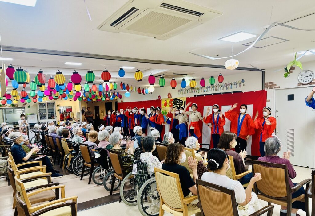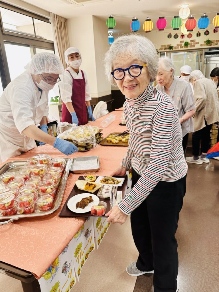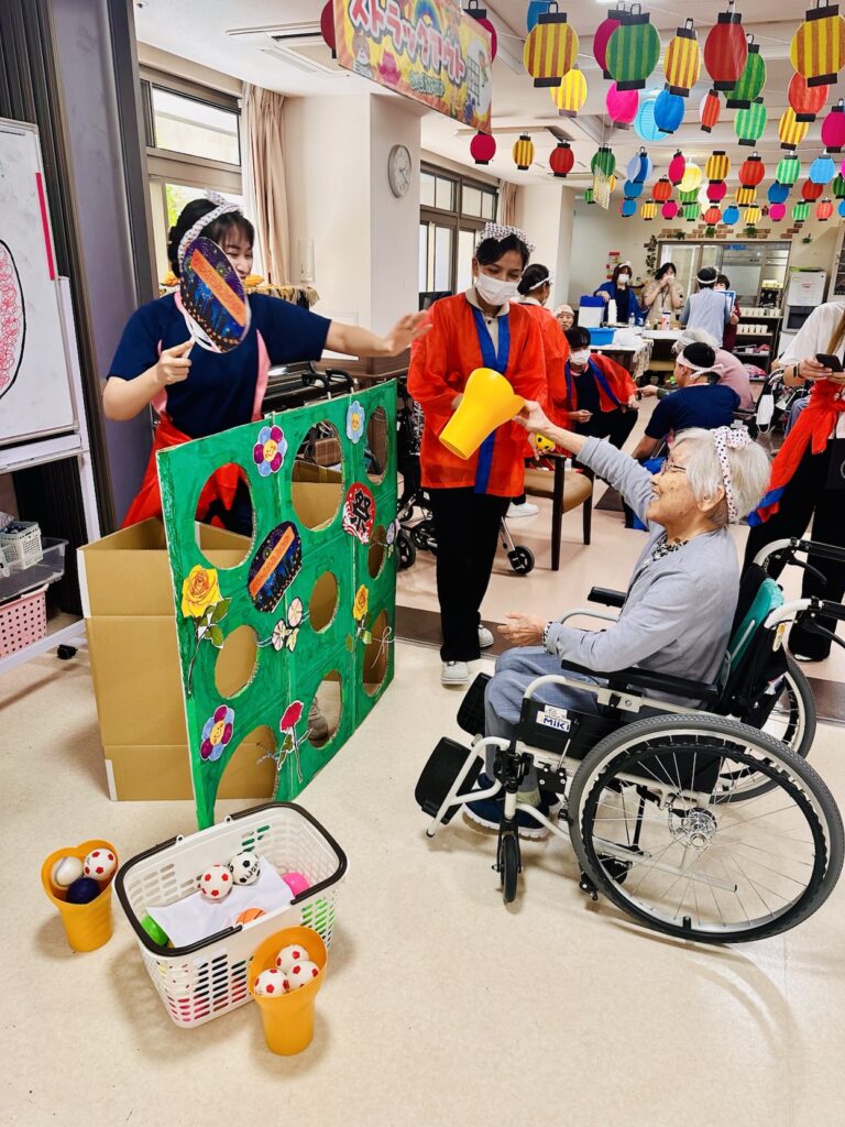 昼食は焼肉・焼きそば・そうめん・おにぎり・フルーツをいただきました🎉🎉🎉 お昼からご入居者様にゲームを楽しんでいただき、最後はみんなで踊って締めくくりました🥰🥰🥰